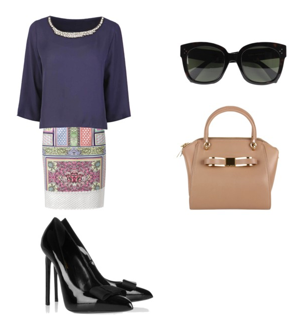 Saia estampada e mais justa mais sem ser vulgar,use um camisa com manga ampla na cor azul,use acessórios na cor preto e bolsa nude.Há necessidade de colar pois a blusa já tem um brilho no colo.