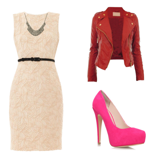 Vestido nude com cinto preto e jaqueta vermelha com scarpin rosa,complete com um colar prata.
