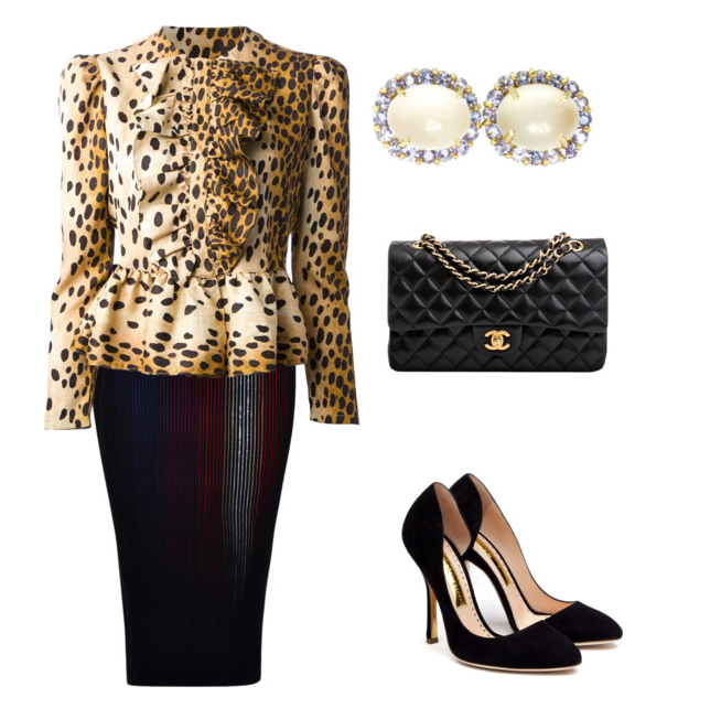 Saia preta com modelo preto,camisa estampado com manga longa e babados no colo e na barra da camisa,acessórios delicado e bolsa tricolo na cor prata,scarpin na cor preto.