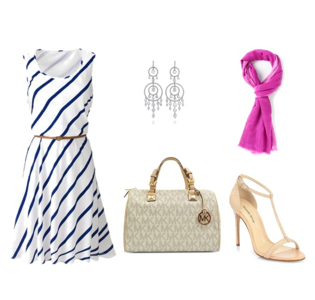 Vestido casual com estampa com as cores branco e azul,acessórios em clean com brinco prata ,bolsa e sandália nude use um lenço rosa/pink para dar uma alegrada no look.