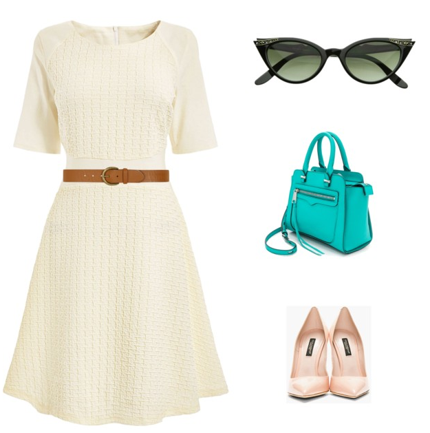 Vestido branco/bage com mangas,cinto fino marrom,óculos preto e bolsa azul;
