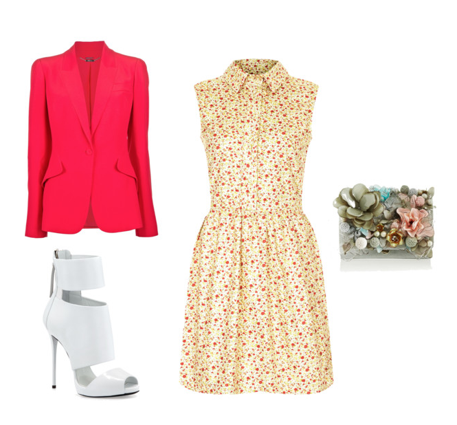 Vestido estampado com flores,use com um blazer amarelo clara e bolsa tricolo bege com detalhes discreto me renda branca,use um scarpin pode ser preto ou nude.