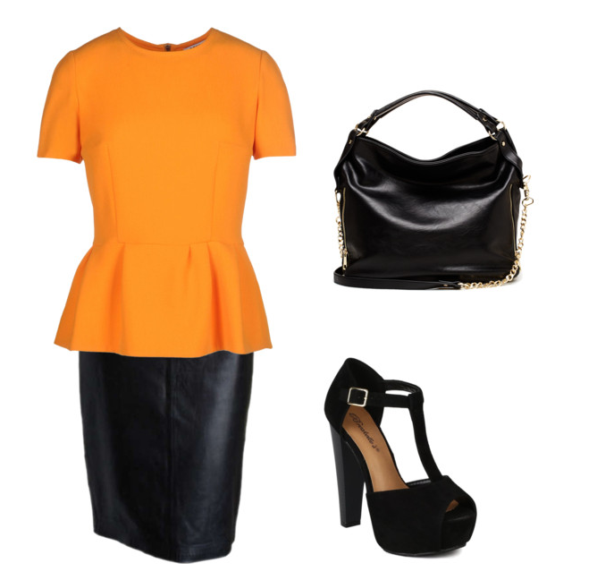Camisa com babados na barra na cor laranja,use tons preto (saia,bolsa,sandália).