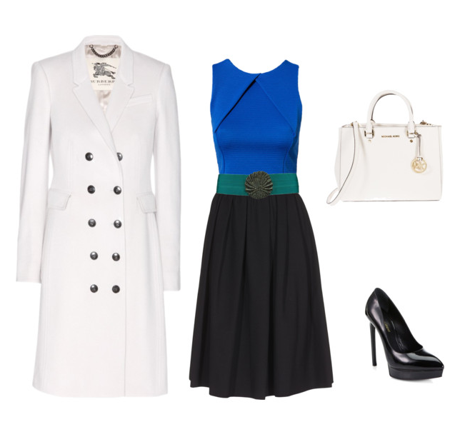 Look elegante,camisa sem manga na cor azul,use um saia midi na cor preta e complete com um cinto na cor próxima da cor da blusa,use um casaco branco e uma bolsa no mesmo tom,nos pés um scarpin de meia parta na cor preto .
