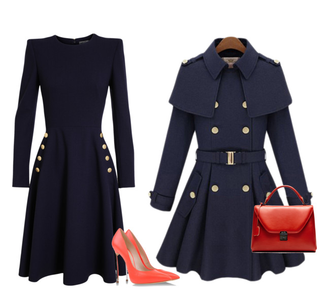 Vestido azul marinho combinando com o casaco,bolsa vermelha com scarpin coral de bico fino.