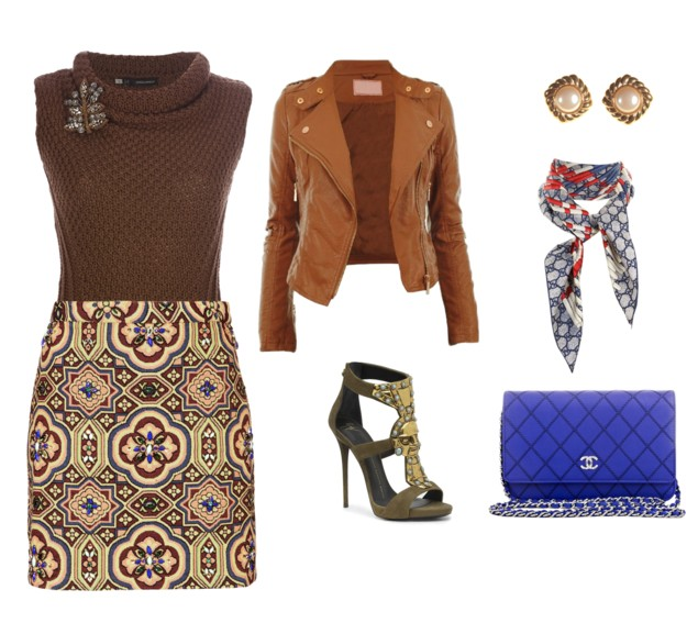 Look para o outono camisa de lã sem mangas,use com um saia estampada complete com um jaqueta de couro na cor marrom mais claro que a camisa sem mangas,use sandálias na cor bronze e para o look não ficar só no marrom use um lenço azul com detalhes em vermelho e branco,bolsa tricolo azul e brinco pequeno na cor bage com marrom e cobre.