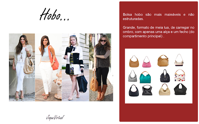 Hoje vou mostrar par vocês acessório, que toda mulher gosta, que são as bolsas pensando nisso separei, os tipos de bolsas, suas características e alguns looks para se inspirar...
