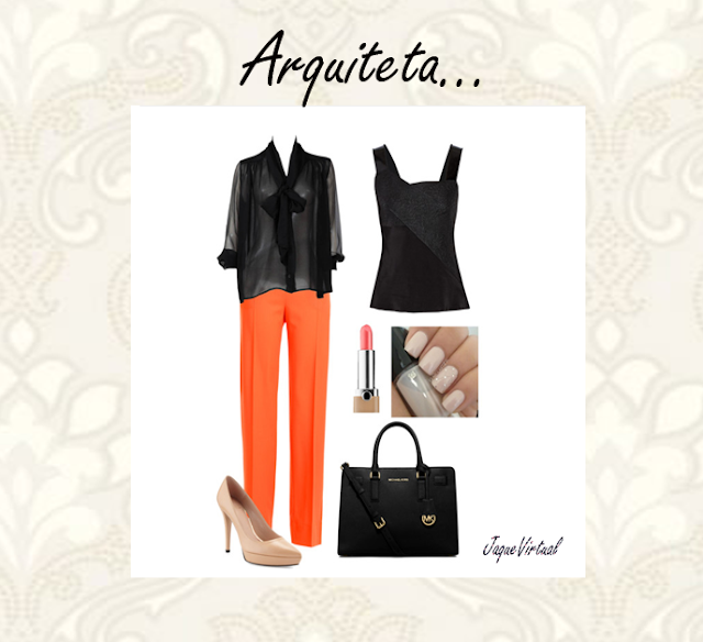 O look de hoje, é para uma arquiteta, coloquei está regatinha, pois a camisa como é transparente, a regata vai por baixo da camisa, dando um ar sensual sem ser vulgar.Para dar uma cor no look investi nesta calça pantalonas na cor laranja.Nos pés optei por scarpin nude para alongar a silhueta...