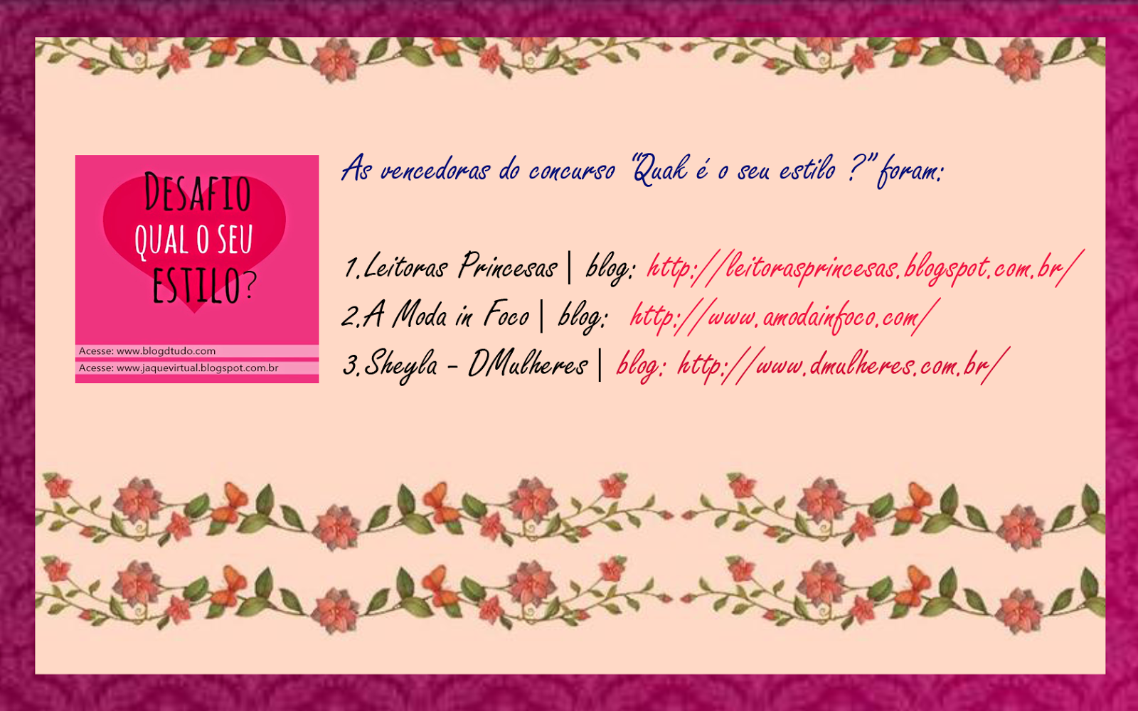 Hoje, saiu o resultado do concurso, qual é o seu estilo, confere logo abaixo as ganhadoras deste concurso, em breve vou mostrar para vocês o estilo de minhas leitoras.