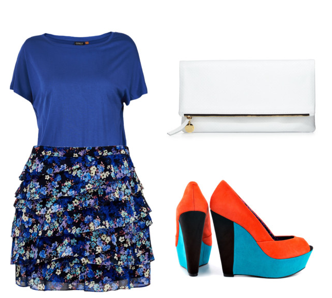 22.Look com um T-shirts na cor azul e saia com babados e floridas,use uma clutch na cor branca e sapato muti cor com laranja,azul e preto combinando com a saia.