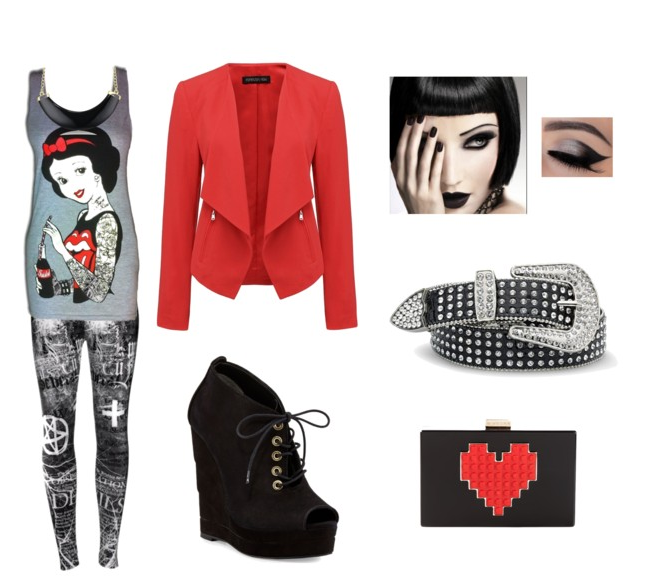 5.Para meninas que gostam deste estilo,na parte de cima use uma regata estampada combinando como o blazer vermelho,já na parte de baixo escolha uma calça legging estampada,nós pés use sapato estilo anabela com cardaços,clutch na cor preta com detalhes em vermelho,maquiagem pesada...
