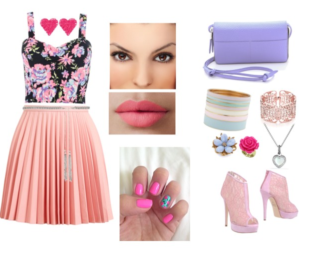 11.Cropped florido com fundo preto,super tendência neste inverno,saia plissada na cor nude/rose,brinco em forma de coração na cor pink,cinto fino na cor prata,complete com uma clutch na com lilás e pulseira na cor candy colors e anel combine com o brinco e bolsa,use bota estilo sandália rosa claro com renda e colar em forma de coração,maquiagem leve,faça unhas igual da imagem abaixo....