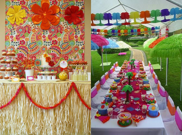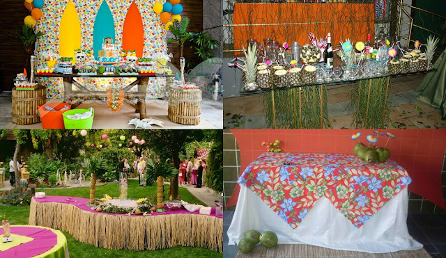 Esse tipo de festa, valoriza o tropicalismo, ou seja muitas flores, frutas, então decore com: muita estampas florais, flores artificiais ou não, sucos naturais, tudo muito colorido e alegre.