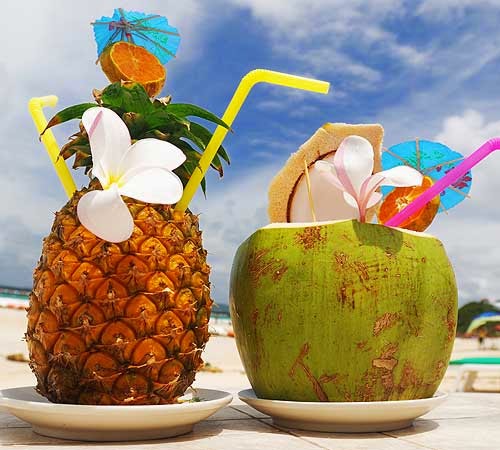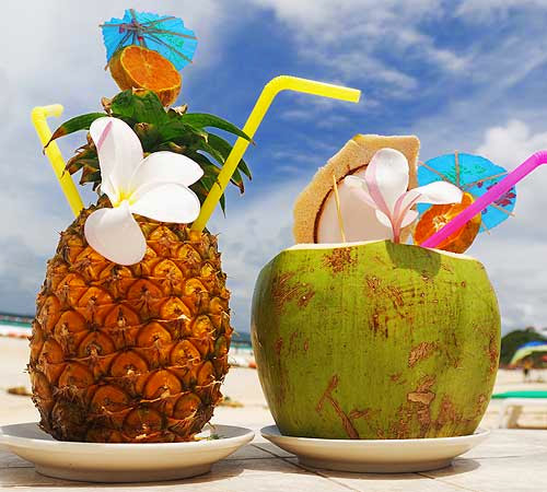 Uma ideia bacana, é servir o drink dentro dos abacaxi e cocos, já que estas frutas não pode faltar, nesta festa temática, para as pessoas que não bebe álcool, sirva água de coco e abacaxi.