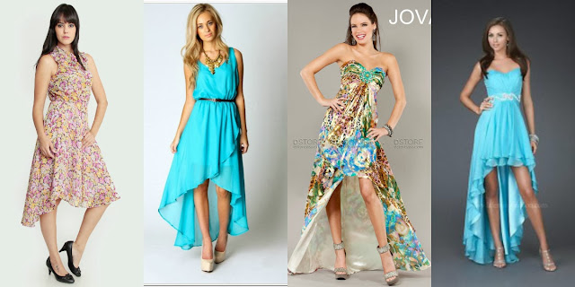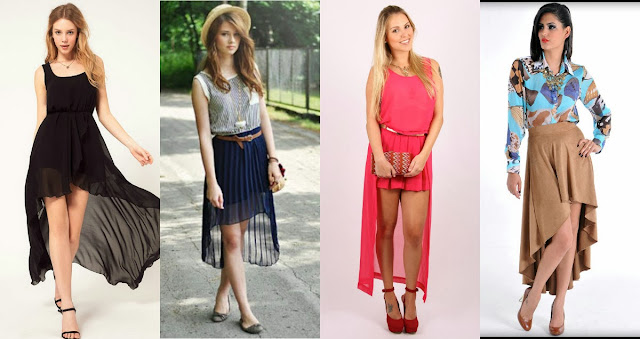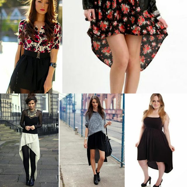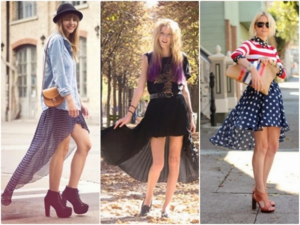O comprimento de trás não influencia muito na ocasião,pois o comprimento da frente segue a linha de raciocínio da saia comum: curto é mais casual e, próximo ao joelho mais formal.