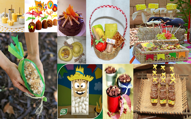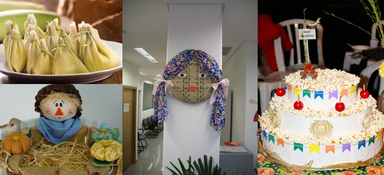 A ideia, é se inspirar em fogueiras, pipocas, personagens e comidas típicas desta festa, segue mais exemplo logo abaixo: